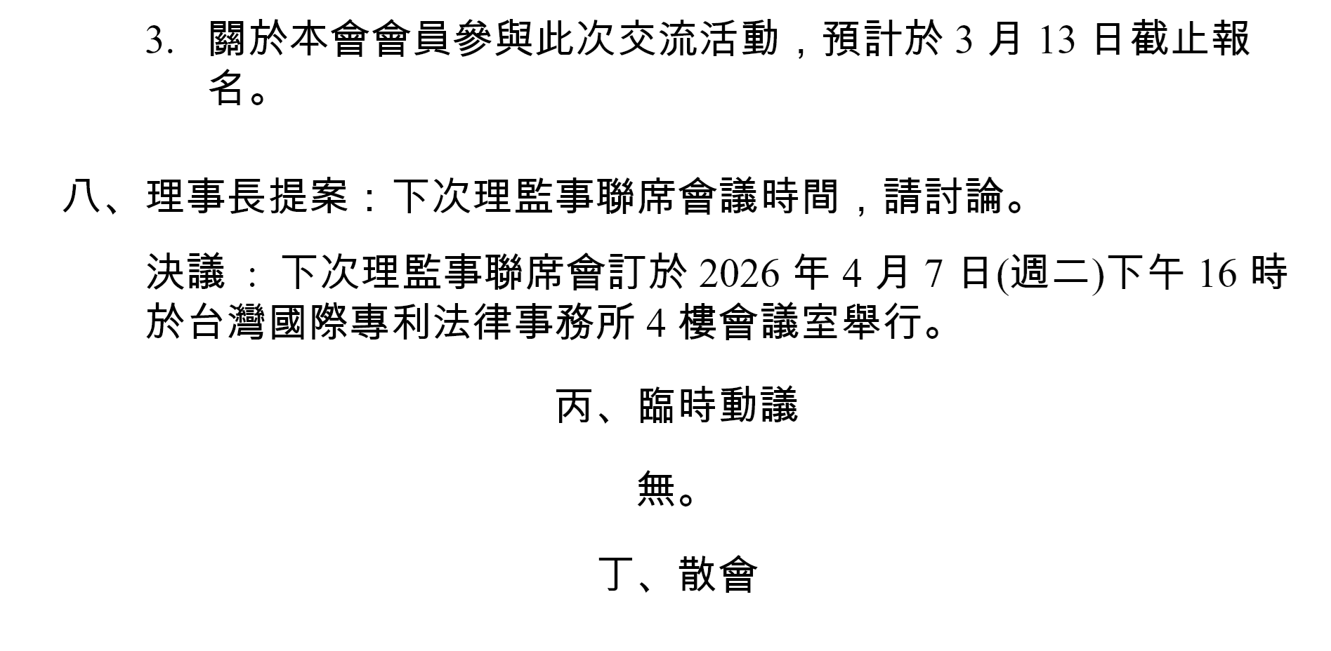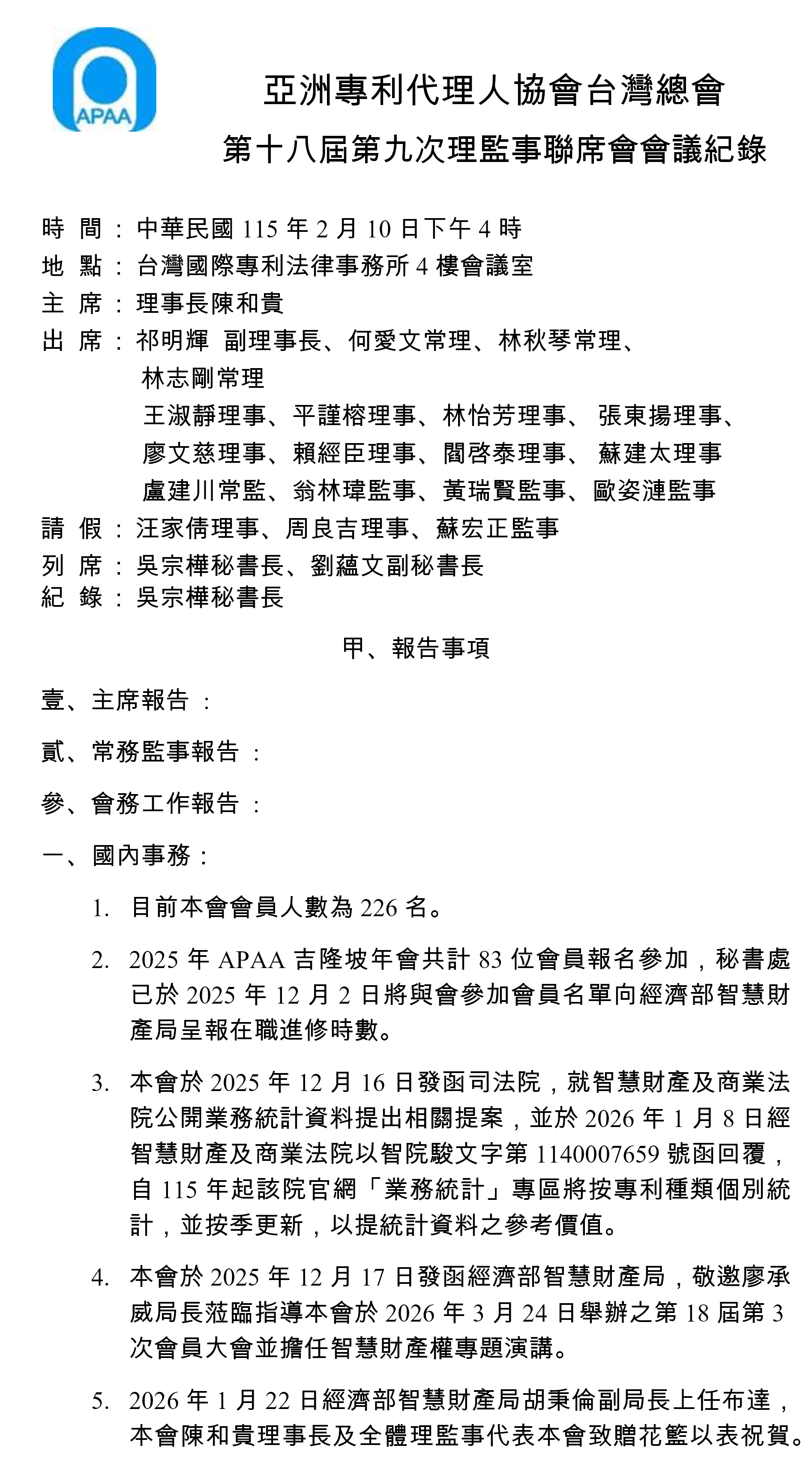 選單 第十八屆第三次會員大會會議紀錄十八屆第九次理監事聯席會會議紀錄第十八屆第三次會員大會議程第十八屆第八次理監事聯席會會議紀錄第十八屆第七次理監事聯席會會會議紀錄第十八屆第六次理監事聯席會會議紀錄第十八屆第二次會員大會會議紀錄第十八屆第五次理監事聯席會會議紀錄第十八屆第二次會員大會議程第十八屆第二次常務理事會會議紀錄第十八屆第四次理監事聯席會會議紀錄第十八屆第三次理監事聯席會會議紀錄第十八屆第一次常務理事會會議紀錄第十八屆第二次理監事聯席會會議紀錄第十八屆第一次監事會議紀錄第十八屆第一次理事會議紀錄第十八屆第一次會員大會會議記錄第十八屆第一次會員大會活動議程第十七屆第三次會員大會會議記錄第十七屆第三次會員大會議程第十七屆第二次會員大會記錄第十七屆第二次會員大會議程(視訊會議)第十七屆第一次會員大會會議記錄第十七屆第一次會員大會議程第十六屆第三次會員大會會議記錄第十六屆第三次會員大會議程第十六屆第二次會員大會記錄第十六屆第二次會員大會活動程序表第十六屆第六次理監事聯席會議紀錄第十六屆第五次理監事聯席會議紀錄第十六屆第四次理監事聯席會議紀錄第十六屆第三次理監事聯席會議紀錄第十六屆第二次理監事聯席會議紀錄第十六屆第一次監事會會議紀錄第十六屆第一次理事會會議紀錄第十六屆第一次會員大會會議記錄第十五屆第3次會員大會議紀錄第十五屆第三次會員大會活動程序表第十五屆第九次理監事會議紀錄第十五屆第八次理監事會議紀錄第十五屆第七次理監事會議紀錄第十五屆第六次理監事會議紀錄第十五屆第五次理監事聯席會議第十五屆第二次會員大會記錄第十五屆第二次會會員大會活動程序表第十五屆第四次理監事聯席會議記錄第十五屆第三次理監事聯席會議紀錄第十五屆第二次理監事聯席會議記錄第十五屆第一次監事會會議紀錄第十五屆第一次會員大會記錄第十五屆第一次會員大會活動程序表第十五屆第一次理事會會議記錄第十四屆第十次理監事聯席會議紀錄第十四屆第九次理監事聯席會議紀錄第十四屆第三次會員大會活動程序表第十四屆第八次理監事聯席會議紀錄第十四屆第七次理監事聯席會議會議記錄第十四屆第六次理監事聯席會議會議記錄第十四屆第五次理監事聯席會議會議紀錄第十四屆第四次理監事聯席會議紀錄第十四屆第三次理事會議紀錄第十四屆第二次理監事聯席會議紀錄第十四屆第一次監事會會議記錄第十四屆第一次理事會會議記錄第十四屆第一次會員大會會議記錄 十八屆第九次理監事聯席會會議紀錄