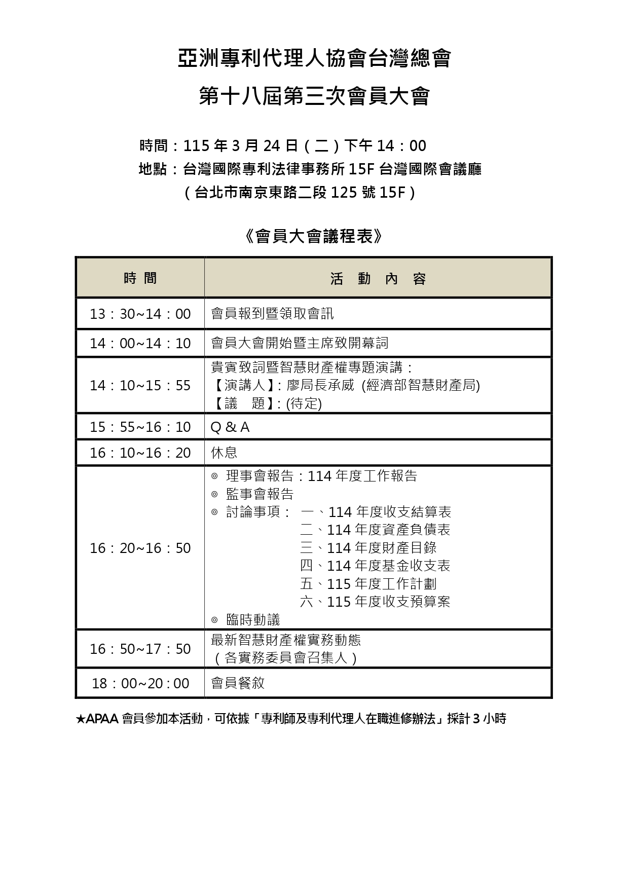 「APAA第十八屆第三次會員大會即將於2026.3.24 (二) 14:00舉行,歡迎會員踴躍出席!」